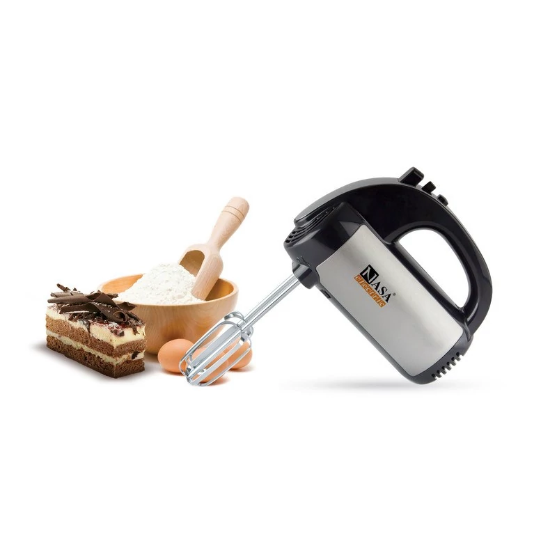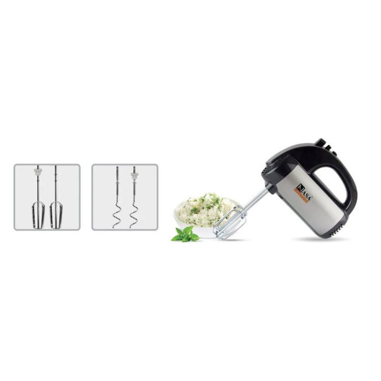 همزن دستی ناسا الکتریک NS-932B یکی از دستگاههای کاربردی و حرفهای در آشپزخانه شماست، که برای هم زدن و مخلوط کردن مواد غذایی مختلف بصورت یکدست و تهیه خمیر و مایه برای انواع کیک و پیتزا و پیراشکی به کار میرود. حداکثر توان مصرفی این همزن 400 وات بوده که قدرت و سرعت لازم را برای این دستگاه به همراه داشته است. بدنه این محصول از جنس پلاستیک با کیفیت ABS با روکش کروم میباشد، که از کیفیت بسیار بالایی برخوردار بوده و همچنین وزن مناسب آن به استفاده آسان آن منجر شده است.
